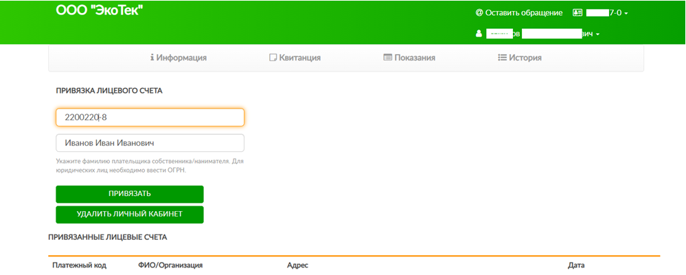 Шаг 6: введите в предложенных полях номер привязываемого (дополнительного) лицевого счета с учетом суффикса территории (см. Шаг 2), ФИО и нажмите кнопку «ПРИВЯЗАТЬ»