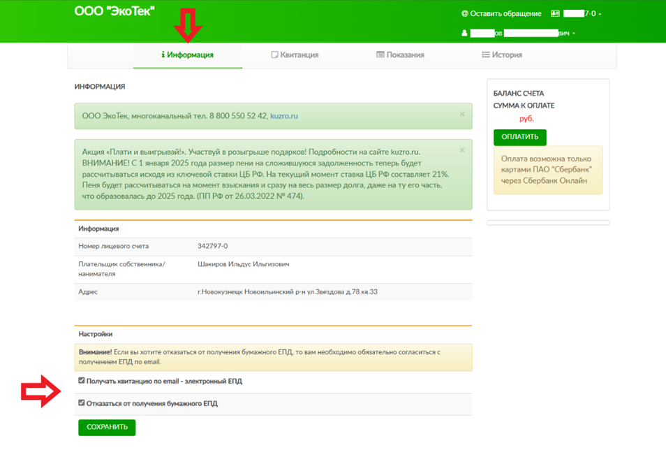 Для получения квитанции на электронную почту в личном кабинете в разделе «Информация» поставьте «галочку» напротив - «Получить квитанцию по email – электронный ЕПД».